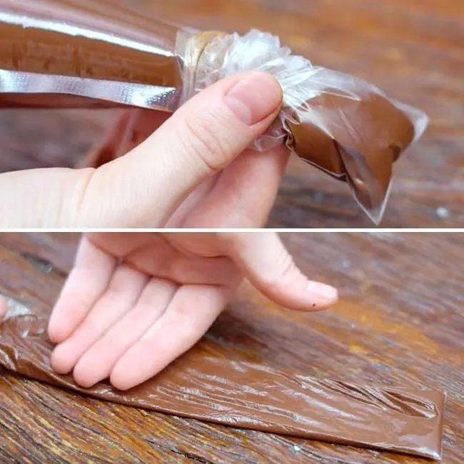 - Aperte o saquinho de geladinho, espalhando o chocolate, deixando sem chocolate apenas a parte que irá dar o nó.