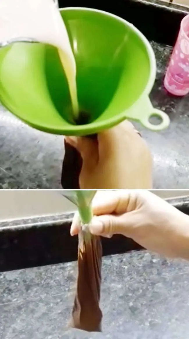 - Em seguida, coloque um funil na boca do saquinho de geladinho e encha com o liquido que foi batido;