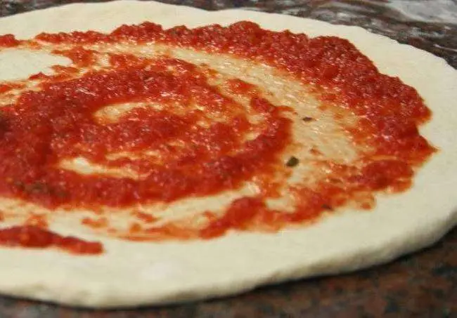Retire a massa pré-assada do forno e espalhe molho de tomate a gosto, por cima da massa